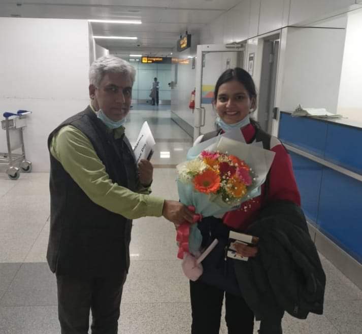तपोवन,संजान: तपोवन,संजान: यूक्रेन में फंसी दमण की छात्रा मानसी शर्मा भारत पहुँची। दमण की छात्रा रोमानिया से एयरइंडिया की विशेष फ्लाइट से दिल्ली पहुँची। यूक्रेन में पढाई कर रही मानसी शर्मा दिल्ली पहुंची वहा दानह ओर दमन दीव हाउस के अधिकारी हरीशचंद्र ने एयरपोर्ट पर स्वागत किया।दिल्ली से दमन सुरक्षित लाने की व्यवस्था प्रशासन ने की। अपने घर दमण सुरक्षित वापस आयी । इसी के चलते यूक्रेन से भारत लौटी दमण की छात्रा मानसी शर्मा ने संघ प्रदेश दादरा नगर हवेली और दमण – दीव तथा लक्षद्वीप के यूक्रेन से दमण ( भारत ) लौटने प्रशासक प्रफुल पटेल ने मुलाकात की । इस मौके पर प्रफुल पटेल के प्रयासों की मानसी शर्मा ने प्रशासक प्रफुल सराहना की । साथ ही उन्होंने पटेल का आभार मानते हुए प्रशासक प्रफुल पटेल को पुष्पगुच्छ देकर उनका आभार जताया । इस अवसर पर प्रशासक प्रफुल पटेल से सकुशल दमण लौटने पर मानसी शर्मा का मुंह मीठा कराया ।
