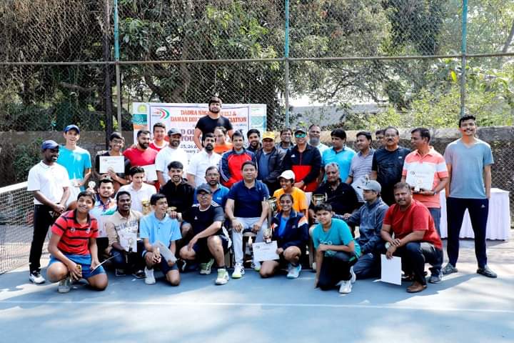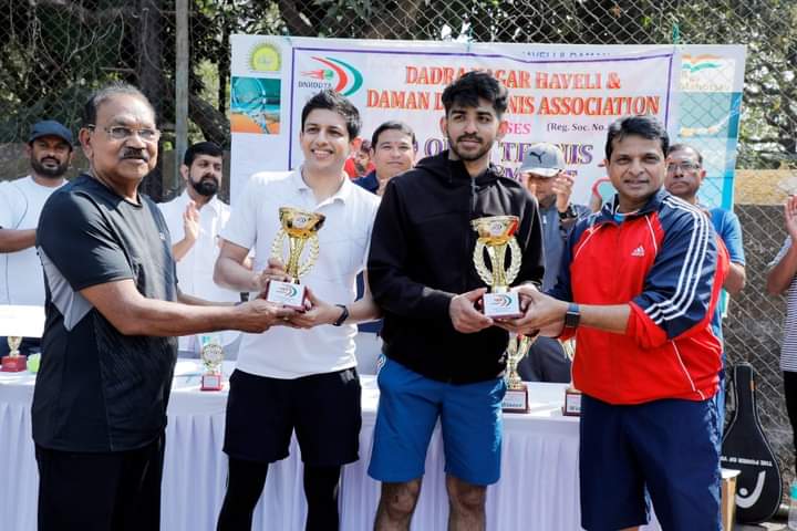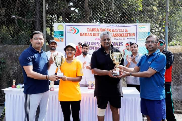 तपोवन,संजान:ज्ञात हो की दादरानगर हवेली और दमण दीव टेनिस एसोसिएशन द्वारा दमण के फोर्ट एरिया मे स्थित टेनिस कोर्ट मे “3डी ओपन टेनिस टूर्नामेंट 2022” का आयोजन हुआ। 21 टीमों के बीच चली इस प्रतियोगिता मे आज डॉ. हंसराज और उनकी साथी खिलाड़ी ऐन्जल पटेल और निशांत टंडेल एवं उसके साथी चिराग पटेल के बीच टूर्नामेंट का अंतिम मैच खेला गया। करीब ढाई घंटे तक चले इस कड़े मुकाबले मे दोनों ही टीमों ने एडी चोटी का जोर लगाते हुवे एक दर्शिनीय खेल का प्रदर्शन किया। अंत मे डॉ. हंसराज और उनकी साथी ऐन्जल का भव्य विजय हुआ। ज्ञात हो की डॉ. हंसराज अपनी 73 साल की उम्र मे भी टेनिस शानदार तरीके से खेलते है और औरों के लिए हमेशा से प्रेरणा श्रोत रहे है। वहीं, उनकी साथी खिलाड़ी ऐन्जल जो केवल १३ साल की है, उन्होंने ने शानदार खेल का प्रदर्शन करते हुवे अपनी टीम को जीत दिलाई।