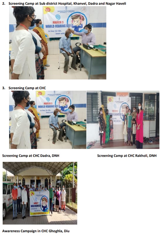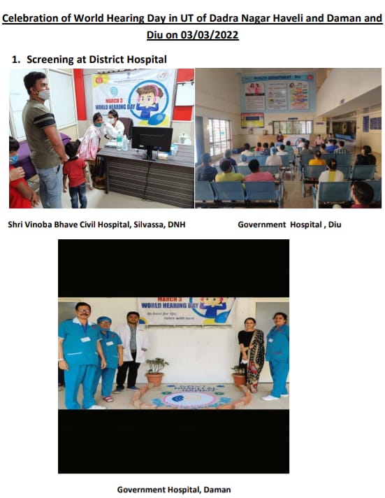 इस अवसर पर ईएनटी विशेषज्ञ डॉ. शरद सातवी द्वारा रिकॉर्ड किए गए वीडियो संदेश को व्हाट्सएप और सोशल मीडिया के विभिन्न माध्यमों के जरिए विभाग द्वारा प्रसारित किया गया । वीडियो में श्रवण हानि से संबंधित मुद्दों की देखभाल के लिए जानकारी प्रदान की गई है। इसके अतिरिक्त दिनांक 03/03/2022 को शाम 6:15 बजे विश्व श्रवण दिवस के अवसर पर डॉ धीरेंद्र पाटिल (ईएनटी विशेषज्ञ) की रेडियों वार्ता का दमण के आकाशवाणी केंद्र से प्रसारण किया गया ।