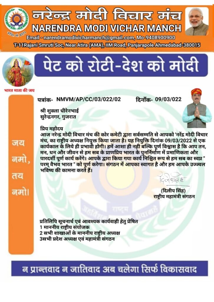 तपोवन ,संजान: नरेंद्र मोदी विचार मंच की राष्ट्रीय कार्यसमिति की बैठक हुई। राष्ट्रीय स्तर पर हुई इस वर्चुअल बैठक में धीरेनभाई शुकल (सुरेंद्रनगर) को सर्वसम्मति से नरेंद्र मोदी विचार मंच का राष्ट्रीय अध्यक्ष नियुक्त किया गया है। सुरेंद्रनगर में आयोजित नेशनल वर्किंग वर्चुअल मीटिंग में शुक्ल के नाम की सर्वसम्मति से अध्यक्ष के रूप में घोषणा की गई। नवनियुक्त राष्ट्रीय अध्यक्ष धीरेनभाई शुक्ल का नरेंद्र मोदी विचार मंच में जिला भाजपा अध्यक्ष जगदीश भाई मकवाना और अन्य गणमान्य व्यक्तियों ने स्वागत किया। सुरेंद्रनगर में आयोजित मोदी विचार मंच की वर्चुअल बैठक में मंच के पदाधिकारियों, शुभचिंतकों और कार्यकर्ताओं ने भाग लिया. शुभचिंतकों ने नरेंद्र मोदी विचार मंच के राष्ट्रीय अध्यक्ष शुक्ल को बधाई दी।