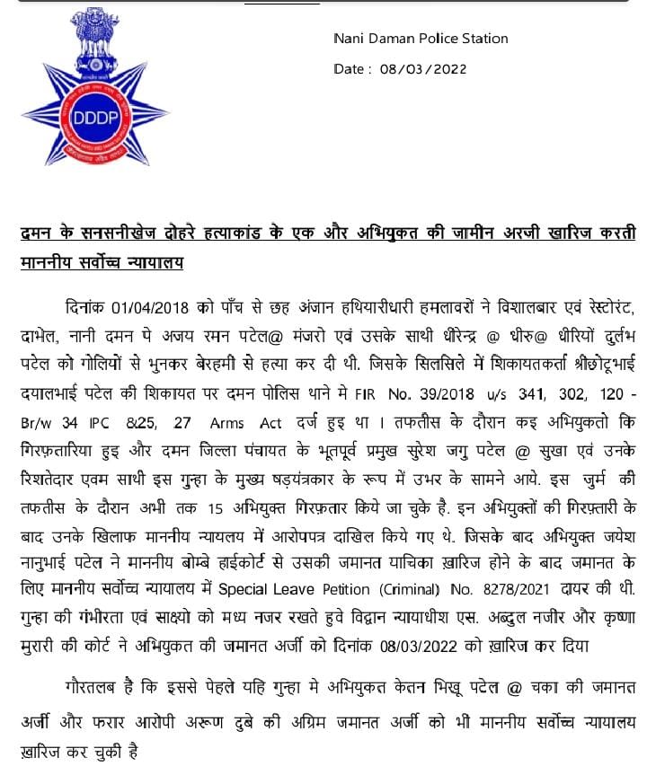तपोवन ,संजान : दि.01-04-2018 को पांच से छह अंजान हथियारधारी हमलावरों ने विशाल बार एवं रेस्टोरेंट, दाभेल नानी दमन पे अजय रमन पटेल उर्फ मंजरों एवं उसके साथी धिरेन्द्र उर्फ धीरू,धिरिया दुर्लभ पटेल को गोलियों से भूनकर बेरहमी से हत्या कर दी थी,जिसके सिलसिले में शिकायतकर्ता छोटूभाई दयालभाई पटेल की शिकायत करने पर दमन पुलिस थाने में FIR No.39/2018 u/s 341,302,120-Br/w 34 IPC & 25,27 arms act दर्ज हुई थी।