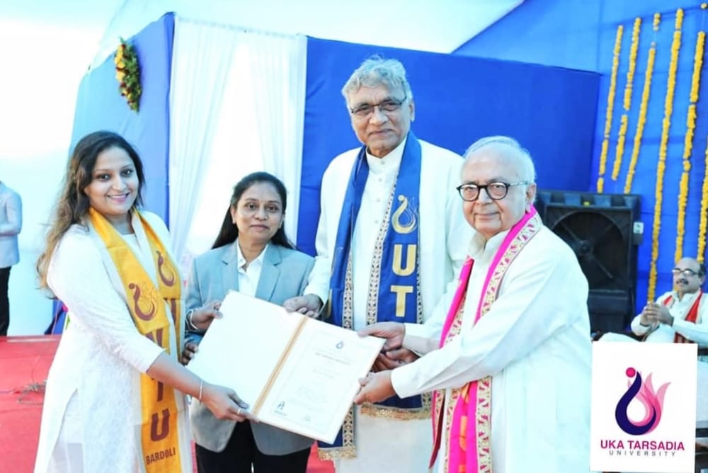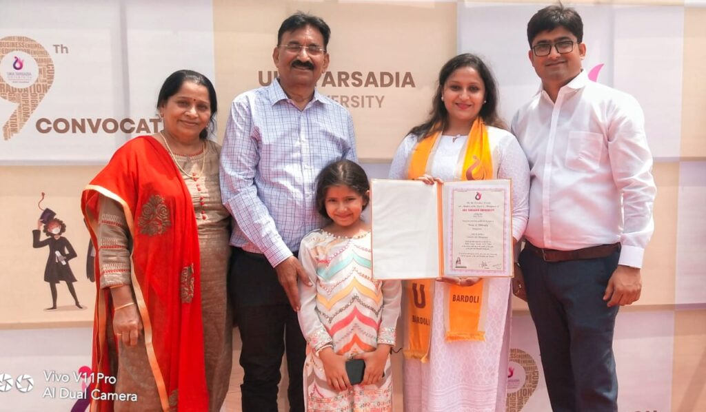 तपोवन, संजान : वापी में आरएस झुनझुनवाला इंटरनेशनल स्कूल में आचार्य के पद पर कार्यरत ऋचा शाह को सीएसआर में उनके प्रबंधन द्वारा प्रस्तुत रिसर्च पत्र के संबंध में उका तरसाडिया यूनिवर्सिटी द्वारा आयोजित भव्य स्नातक समारोह में विशेष अतिथि के रूप में पद्म श्री सावजीभाई ढोलकिया की उपस्थिति में डॉक्टरेट की डिग्री नवाजा गया.इस रिसर्च पत्र को तैयार करने में डॉ. बी.वी. पटेल ओर कॉमर्स कॉलेज को डायरेक्टर डॉ.अपर्णा पटेल ने बहुत महत्वपूर्ण योगदान दिया। उन्होंने ऋचा शाह को भी बधाई दी!