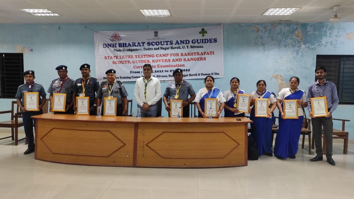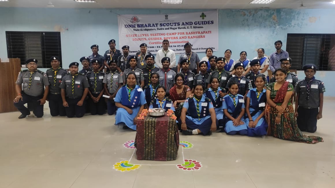 जिसमें सभी 26 उत्कृष्ठ राष्ट्रपति पुरस्कार प्रतिभागियों के लिए राष्ट्रीय मुख्यालय भारत स्काउट गाइड ने मुख्य परीक्षक स्काउट वेस्टर्न रेलवे से अब्दुल शेख, गाइड में शलमा शेख, छतिषगढ़ राज्य के रोवर से विशव देव, रेंजर से कैशरीन बैग, एवम लुकेश्वरी को नियुक्त किया गया साथ ही राजस्थान राज्य से अभय सिंह शेखावत को प्रेक्षक के रूप में विशेष नियुक्ति की गई थी जिसमे राज्य मुख्यालय दानह भारत स्काउट गाइड से सहयोगी के रूप में लायंस इंग्लिश स्कूल से स्काउट मास्टर आलोक कुमार झा, गाइड कैप्टन रुबीना सैयद, आलोक पब्लिक स्कूल से गाइड कैप्टन, मनीष झा एवम अनवर वसाया के साथ शिविर संचालक के रूप में यास्मीन वसाया राज्य आयोजक आयुक्त गाइड को नियुक्त किया गया था. जिसमें दादरा नगर हवेली लायन्स इंग्लिश स्कूल, जय हिंद ओपन स्काउट गाइड, आजाद रोवर क्रू रेंजर टीम के डॉ ऐपिजे अब्दुल कलाम शासकीय महाविद्यालय एवम गुजरात राज्य के कुल 26 चयनित स्काउट गाइड रोवर रेंजर पांच दिवशीय शिविर में बढ़ाया गया उत्साह जिसमें नियम प्रतिज्ञा, खोज बिन के संकेत, प्राथमिक उपचार, नोटिंग, लेसिंग, पायोनियरिंग, शिविर संचालन सभी में पूर्ण रूप से परीक्षण कर उत्तीर्ण प्रतिभागियों को नई दिल्ली के लिए चयनित किया गया. सभी का उत्साह बढ़ाने के लिए गिनिस विश्व रिकॉर्ड छतिषगढ़ लोक कर्मा नृत्य पर सभी प्रतिभागियों के साथ साथ सिद्धार्थ जैन ने भी लुत्फ उठाया. इसके बाद अब्दुल शेख ने दानह भारत स्काउट गाइड के कार्यकलापों की सराहना की एवम बताया कि दानह भारत स्काउट गाइड की नींव रखने वाले साक्षी रहे हैं जिसमें उन्हें गर्व हो रहा है कि दानह भारत स्काउट गाइड इस ऐतिहासिक क्षण की ओर अग्रसर हो रहा हैं जिसमें प्रतिभागी भारत के राष्ट्रपति द्वारा सम्मान लेंगे अपने संबोधन में दानह पुलिस उप अधीक्षक सिद्धार्थ जैन ने बताया कि दानह भारत स्काउट गाइड सेवाभावी एवम कर्तव्यनिष्ठ है जिससे दादरा नगर हवेली प्रशासन को गर्व होगा कि इतने कम उम्र में ही सामाजिक सेवा के लिए महामहिम राष्ट्रपति से सम्मान मिलेगा. अब्दुल शेख ने शिविर व्याख्या की प्रस्तुति दी एवम बताया की और भी तौयरी की आवश्यकता है इसके बाद अंजलि सैन एवम जिल वसाया ने राजस्थानी लोक नृत्य से सभी को मनमुग्ध कर दिया .राष्ट्रपति पुरस्कार परिक्षा के लिए छुट्टी नही मिलने पर शुभांगी शेवाले को 108 आपातकालीन सेवा से देना पड़ा त्यागपत्र दृढ़ संकल्प के लिए सिद्धार्थ जैन ने पुलिस मुख्यालय में 112 आपातकालीन सेवा से जुड़कर आगे बढ़ने का दिया अवसर जिसमें सिद्धार्थ जैन ने वेस्टर्न रेलवे, राजस्थान एवम छतिषगढ़ सभी राज्यों से आये हुए परीक्षकों का दादरा नगर हवेली प्रशासन की ओर आभार माना एवम बताया की आने वाले समय में दानह भारत स्क