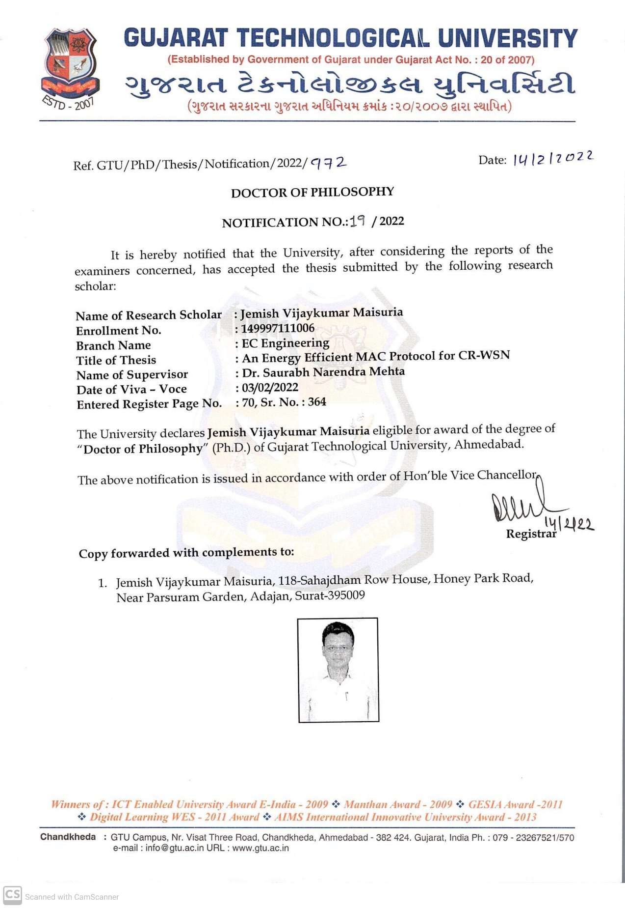 तपोवन,संजान :सूरत-बारडोलीकी सी.जी.पटेल इंस्टीट्यूट ऑफ टेक्नोलॉजी,उका तरसाडिया यूनिवर्सिटी में सह प्रोफेसर जेमीश विजयकुमार मैसूरिया ने गुजरात टेक्नोलॉजिकल यूनिवर्सिटी, अहमदाबाद को “एनर्जी-एफिशिएंट मैक प्रोटोकॉल फॉर सी आर-डब्ल्यूएसएन” शीर्षक के तहत अपना शोध प्रबंध प्रस्तुत किया ओर पीएच.डी की उपाधी प्रदान की गई है।