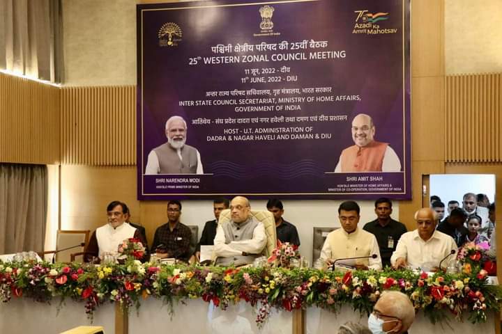 केन्द्रीय गृह एवं सहकारिता मंत्री श्री अमित शाह ने आज दीव में पश्चिमी क्षेत्रीय परिषद की 25वीं बैठक की अध्यक्षता की। बैठक में गोवा, गुजरात के मुख्यमंत्री और दादरा और नगर हवेली और दमन और दीव के प्रशासकों, गुजरात और महाराष्ट्र के वरिष्ठ मंत्रियों, केन्द्रीय गृह सचिव, पश्चिमी क्षेत्र के सदस्य राज्यों के मुख्य सचिव, सचिव, अंतरराज्यीय परिषद सचिवालय सहित केन्द्रीय और राज्यों के मंत्रालयों और विभागों के वरिष्ठ अधिकारी शामिल थे। ये पहली बार है कि पश्चिमी क्षेत्रीय परिषद की बैठक का आयोजन दादरा और नगर हवेली और दमन और दीव में किया है।