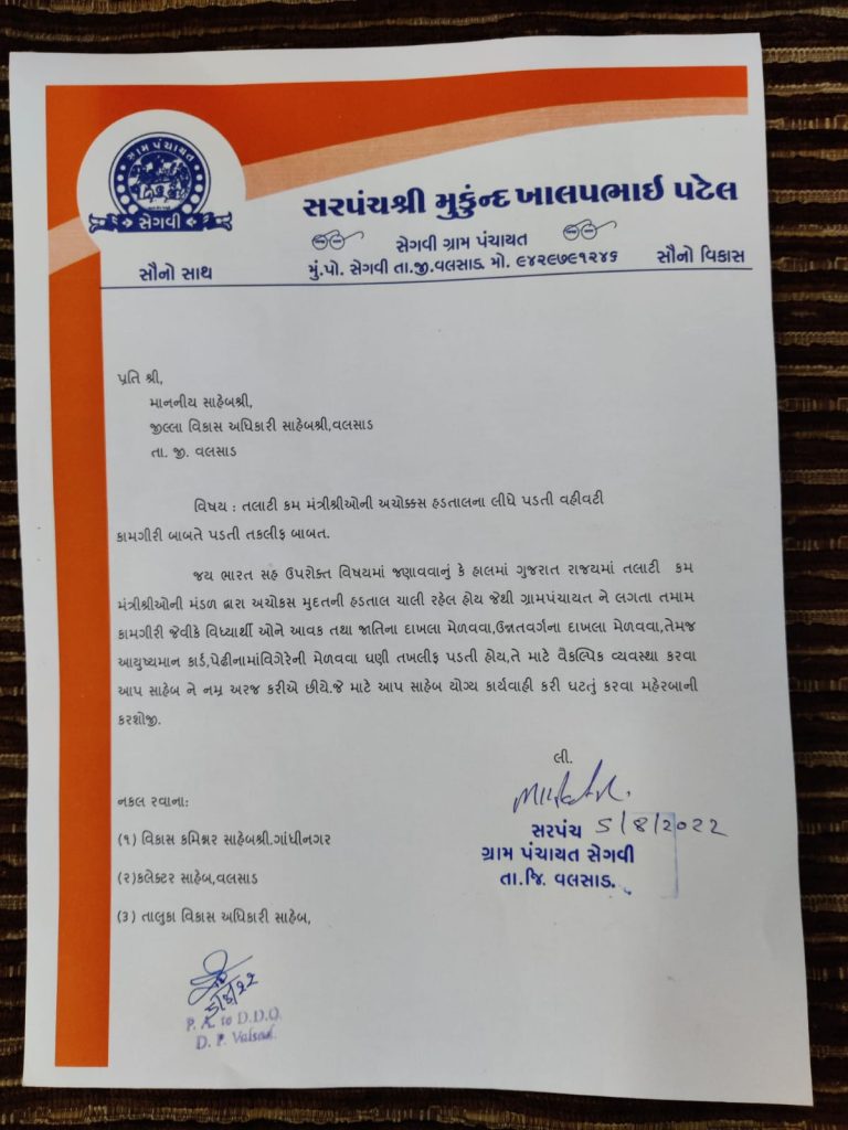 सेगवी ग्राम पंचायत के सरपंच मुकुंद खालपभाई पटेल ने जिला विकास अधिकारी को पत्र लिखा है,सरपंच मुकुंदभाई पटेल ने पत्र में आम जनता को इस हड़ताल के कारण हो रही दिक्कतों के बारे में लिखा है और जल्द से जल्द इस समस्या का हल ढूंढने की मांग की है।