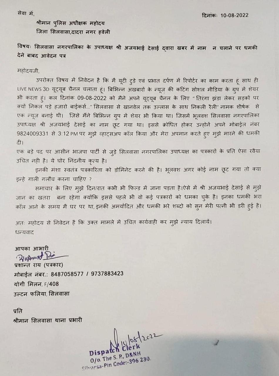 यूटी टुडे एवं प्रभात दर्पण सहित कुछ स्थानीय अखबार में काम करते हैं। साथ में LIVE NEWS 3D के नाम से यूट्यूब चैनल चलाते हैं। बिभिन्न अखबारों के न्यूज की कटिंग सोशल मीडिया के ग्रुप में शेयर भी करते हैं। दरमियान दिनांक 09-08-2022 को यूट्यूब चैनल के लिए “ तिरंगा झंडा लेकर सड़कों पर क्यों निकल पड़े हजारो बाईकर्स…” सिलवासा से खानवेल तक उल्लास के साथ निकली रैली” नामक शीर्षक से एक न्यूज बनाई थी। जिसे विभिन्न ग्रुप में शेयर भी किया था। न्यूज में सिलवासा नगरपालिका उपाध्यक्ष अजयभाई देसाई का नाम नही होने से इतना क्रोधित हो गये कि उन्होनें अपने मोबाईल नंबर 9824009331 से 3:12 PM पर पत्रकार प्रशान्त राय को व्हाट्सअप नंबर 8487058577 पर कॉल किये और अपमान करते हुए मारने की धमकी दी।