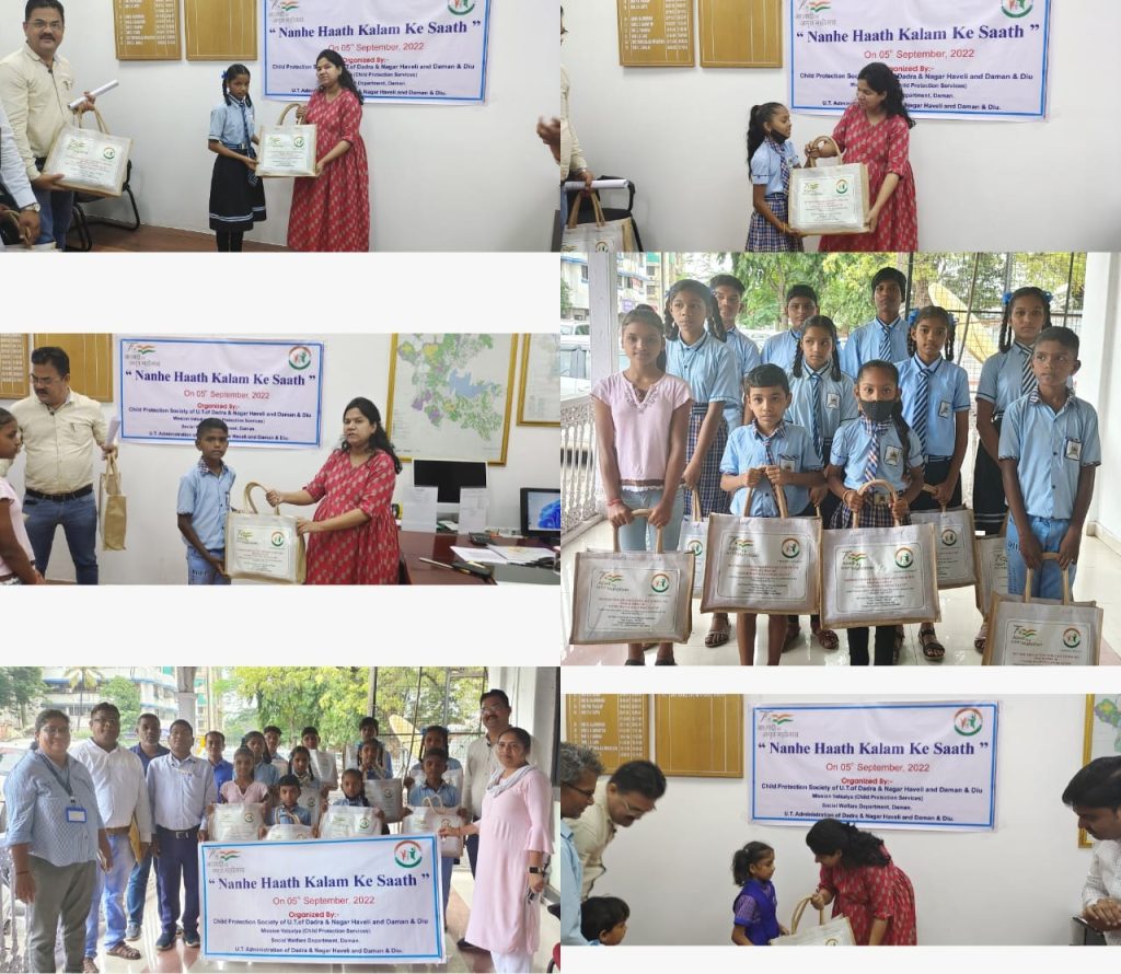 तपोवन, संजान : समाज कल्याण विभाग, बाल संरक्षण समिति दादरा एवं नगर हवेली तथा दमण एवं दीव द्वारा जरुरीयातमंद, देखभाल एवं संरक्षण की आवश्यकता वाले बच्चो को शिक्षा से जोड़े रखने के उद्देश्य से “नन्हे हाथ कलम के साथ” कार्यक्रम समाहर्तालय दादरा एवं नगर हवेली समाहर्ता के कक्ष में किया गया। यह कार्यक्रम समाज कल्याण एवं महिला बाल विकास विभाग सचिव/दादरा एवं नगर हवेली समाहर्ता श्रीमती भानु प्रभा के मार्गदर्शन एवं विभाग के निर्देशक श्री जतिन गोयल के नेतृत्व में किया गया। इस सम्बन्ध में जानकारी देते हुए बाल संरक्षण समिति दादरा एवं नगर हवेली तथा दमण एवं दीव के प्रोग्राम मैनेजर संजीवकुमार पंड्या ने बताया की विभाग द्वारा तीनों जिलों की सरकारी एवं सरकारी सहाय प्राप्त स्कुलो से जरुरीयातमंद, देखभाल एवं संरक्षण की आवश्यकता वाले बच्चों कि जानकारी मंगवाइ गई । ईसमे दादरा एवं नगर हवेली, दमण एवं दीव तीनो जिलो में से बच्चों के नाम की सूची स्कुलो द्वारा विभाग को भेजी गयी। जिसमे देखभाल एवं संरक्षण की आवश्यकता वाले बच्चे है, ऐसे बच्चों को शैक्षणिक सामग्री की 2377 किट बनाकर दादरा एवं नगर हवेली, दमण एवं दीव के बच्चों को दि जाएगी। आज समाहर्तालय दादरा एवं नगर हवेली समाहर्ता के कक्ष से विभाग के सचिव/दादरा एवं नगर हवेली समाहर्ता श्रीमती भानु प्रभा के कर कमलो द्वारा जरुरीयातमंद, देखभाल एवं संरक्षण की आवश्यकता वाले 14 बच्चों को शैक्षणिक सामग्री किट देकर इस प्रतीकात्मक कार्यक्रम का शुभारंभ किया गया । इस अवसर पर समाज कल्याण एवं महिला बाल विकास विभाग सचिव ने बाल संरक्षण समिति की सराहना करते हुए कहा की समय समय पर ऐसे कार्यक्रम का आयोजन कर के बच्चों का होंसला अफजाई करना चाहिए जिससे की बच्चों मे पढाइ के प्रती रुचि बनि रहे और अपने जिवन मे आगे बढे साथ ही उन्होंने उन सभी औध्योगिक इकाया जिन्हों ने कोर्पोरेट सोसियल रिस्पोंसिबिलिटी के तहत शैक्षणिक सामग्री किट [सामग्री जैसेकी पेन,पेन्सिल, कंपास बॉक्स, टिफ़िन बॉक्स, पानी कि बोतल, नोट बुक]। यह शैक्षणिक सामग्री किट दाता कंपनियों में ऑल टाइम प्लास्टिक, रियल प्लास्टिक, होम लाइन प्रोडक्टस, बिक सेलो एक्सपोर्ट प्राइवेट लिमिटेड, फ्लेयर पेन, नवनीत गाला, नायसा सुपरप्लास्ट, हिंदुस्तान पेंसिल प्राइवेट लिमिटेड कंपनी का धन्यवाद ज्ञापित किया और कहा की भविष्य में भी ऐसे ही जरुरीयातमंद, देखभाल एवं संरक्षण की आवश्यकता वाले बच्चों को सहयोग देकर प्रोत्साहित करते रहे।विभाग द्वारा तीनों जिलों के जरुरीयातमंद, देखभाल एवं संरक्षण की आवश्यकता वाले बच्चों तक यह शैक्षणिक सामग्री किट पहुंचायी जाएगी।यह कार्यक्रम समाज कल्याण एवं महिला एवम बाल विकास विभाग के निर्देशक श्री जतिन गोय