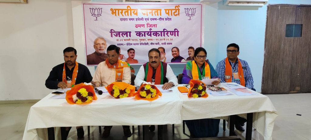 तपोवन, संजान : दमन ज़िला कार्यकारिणी बैठक भारतीय जनता पार्टी दादरा नगर हवेली एवं दमन दिव प्रदेश के अध्यक्ष श्री दीपेश टंडेल जी के मार्गदर्शन में आज दमन ज़िला भाजपा की कार्यकारिणी की बैठक जिला के अध्यक्ष श्री असपि दमनिया की अध्यक्षता में नानी दमन स्थित होटल सागर प्रेसीडेंसी में आयोजित हुई। दीप प्रज्वलन के पश्चात शरु हुई इस बैठक में दमन नगरपालिका की अध्यक्षा श्रीमती सोनल बेन पटेल और प्रदेश उपाध्यक्ष श्री महेश अगरिया की विशेष उपस्थिति रही।