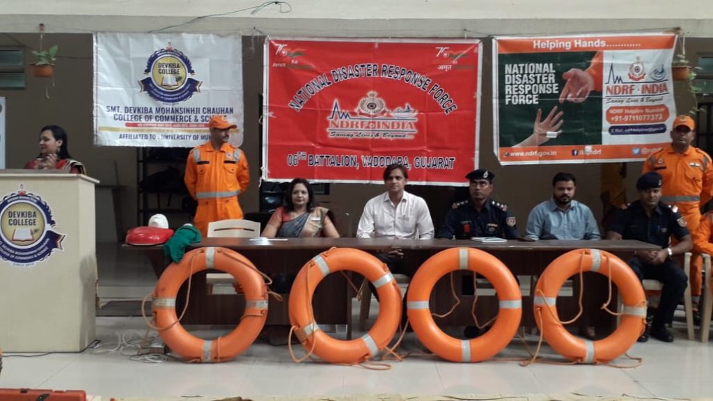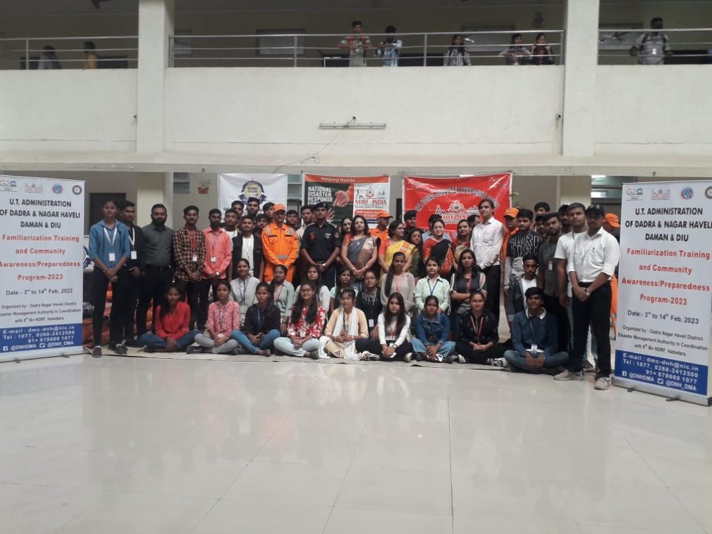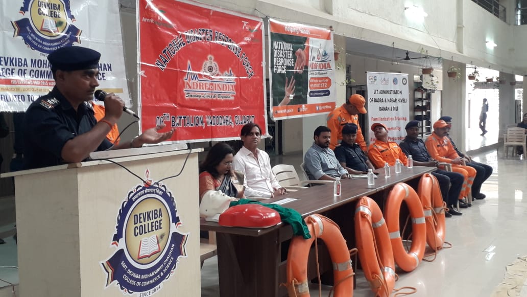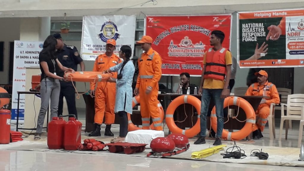 तपोवन, संजान:। आपदा से बचाव एवं प्रबंधन के लिए विभिन्न संस्थानों और हितधारकों को सशक्त बनाने के लिए संघ प्रदेश दादरा नगर हवेली एवं दमण-दीव प्रशासन परिचय प्रशिक्षण एवं सामुदायिक जागरूकता / तैयारी कार्यक्रम-2023 का आयोजन कर रही है। 3 फरवरी से 14 फरवरी तक चलने वाली प्रशासन की ओर से इस प्रशिक्षण कार्यक्रम में एनडीआरएफ की टीमें लगातार मॉक अभ्यास, क्षमता निर्माण कार्यक्रम व जन जागरुकता अभियान चला रही हैं। साथ ही शिक्षण संस्थानों में आपदा से बचाव के लिए स्कूलों तथा कॉलेजो में एक दिवसीय प्रशिक्षण कार्यक्रम आयोजित कर रही हैं।दादरा नगर हवेली जिला आपदा प्रबंधन प्राधिकरण 6थें एनडीआरएफ, वडोदरा के समन्वय में यह प्रशिक्षण शिविर आयोजित की जा रही है।इसी कड़ी में शुक्रवार दिनांक 3 फरवरी 2023 को श्रीमती देवकीबा मोहनसिंहजी चौहान कॉलेज ऑफ कॉमर्स एंड साइंस के प्रशिक्षण केन्द्र में भी एक कार्यशाला का आयोजन किया गया।प्रशिक्षण में वडोदरा से आई 6थी बटालियन के एनडीआरएफ की प्रशिक्षित एवं अनुभवी टीम द्वारा सीपीआर, गले में फंसी बाहरी वस्तु के निकालने के तरीके, शारीरिक चोटों का अस्पताल पूर्व उपचार, तात्कालिक स्ट्रेचर बनाना, लिफ्टिंग और मूविंग के तरीके, अग्निशमन और आग से बचाव की तकनीक, रस्सी से बचाव की तकनीक, अग्निशामक यंत्र का उपयोग, इम्प्रोवाइज्ड फ्लोटिंग डिवाइस (राफ्ट) बनाना, सड़क सुरक्षा, हीट-स्ट्रोक से बचाव, जागरूकता आदि विभिन्न विषयों पर प्रशिक्षण प्रदान किया गया। इस कार्यक्रम के दौरान उपस्थित छात्रों से भी अभ्यास कराया गया। जिसमें श्रीमती देवकीबा मोहनसिंह चौहान कॉलेज ऑफ कॉमर्स एंड साइंस के विद्यार्थियों, शिक्षकों और कॉलेज के अन्य कर्मचारियों ने बढ़-चढ़ कर भाग लिया।इस अवसर पर श्रीमती देवकीबा मोहनसिंह चौहान कॉलेज ऑफ कॉमर्स एंड साइंस की इंचार्ज प्रिंसिपल डॉ. सीमा पिल्लई ने एनडीआरएफ का आभार व्यक्त करते हुए कहा कि एनडीआरएफ द्वारा आयोजित जागरूकता कार्यक्रम बहुत शिक्षाप्रद है। इस कार्यक्रम से प्रशिक्षण केंद्र के विद्यार्थी व अध्यापक लाभान्वित होंगे। वे आपदा के दौरान अपने और अन्य लोगों के जीवन को बचाने में सहयोग प्रदान कर पाएंगे। उन्होंने ऐसे प्रशिक्षण कराते रहने के लिए लायंस क्लब ऑफ सिलवासा चैरीटेबल ट्रस्ट के चेयरमैन फतेहसिंह चौहान का आभार व्यक्त किया जिनके मार्गदर्शन में यह कार्यक्रम का आयोजन किया गया।