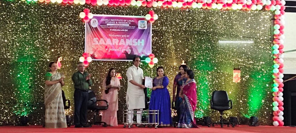 सिलवासा। मुंबई विश्वविद्यालय से मान्यता प्राप्त शिक्षा संस्था हवेली इंस्टीट्यूट ऑफ लीगल स्टडीज एंड रिसर्च में दिनांक 23 अप्रैल 2023 को विदाई समारोह का आयोजन किया गया। जिसमें लायंस क्लब ऑफ सिलवासा चैरीटेबल ट्रस्ट के चेयरमैन फतेहसिंह चौहाण सहित हवेली इंस्टीट्यूट ऑफ लीगल स्टडीज एंड रिसर्च इंचार्ज प्रिसिंपल निशा पारेख, वाइस प्रिसिंपल शिल्पा तिवारी, लायंस इंग्लिश स्कूल के प्रिंसिपल डॉ. फ्रासिंस, वाईस प्रिसिंपल निराली पारेख, श्रीमती देवकीबा मोहनसिंहजी चौहान कॉलेज ऑफ कॉमर्स एंड साइस की इंचार्ज प्रिसिंपल डॉ. सीमा पिल्लई, उपस्थिति के साथ-साथ शिक्षक गण एवं विद्यार्थी भी इस मौके पर मौजूद रहे। विदाई समारोह की शुरूआत संयुक्त रूप से दीप प्रज्ज्वलित कर की गई। तदोपरांत कॉलेज के छात्र एवं छात्राओं द्वारा सांस्कृतिक कार्यक्रम पेश किया गए। कार्यक्रम का विषय भारत एक रंग अनेक था।समारोह में विशिष्ट छात्रों की उपलब्धियों को भी सम्मानित किया गया। जिनमें बी.एल.एस.एलएल.बी. ४थे वर्ष की छात्रा कुमारी सिमरन सोनी की परियोजना को 17 वें अविष्कार इंटरकॉलेजिएट रिसर्च कन्वेंशन 2022-23 में जोनल स्तर पर सर्वश्रेष्ठ शोध परियोजना के रूप में चुना गया और उन्होंने मुंबई विश्वविद्यालय से एक प्रमाण पत्र और 10 ग्रेस अंक भी प्राप्त किए हैं। II/C प्रिंसिपल निशा पारेख उनकी गाइड थीं और उन्होंने इस सफलता को प्राप्त करने के लिए सिमरन सोनी का समर्थन और मार्गदर्शन किया।विपुल रुनथला एवं शैलेश मिश्रा टी.वाई.एलएल.बी. और नौशीन अय्यर बी.एल.एस.एलएल.बी. के प्रथम वर्ष के छात्र एस.एस. मनियार लॉ कॉलेज जलगाँव में आयोजित राष्ट्रीय मूट कोर्ट प्रतियोगिता में विजेता रहे।राहुल शर्मा एवं सौरभ तिवारी टीवाईएलएलबी से और ईशा रोहित प्रथम वर्ष बीएलएसएलएलबी की छात्रा ने बनारस हिंदू विश्वविद्यालय में आयोजित राष्ट्रीय मूट कोर्ट प्रतियोगिता में भाग लिया था। इन्हें सम्मानित किया गया।साथ ही मंथन पाठक (TYLLB) मिस्टर किंग चुने गये और टिंकिता राठौड़ (टीवाईएलएलबी) मिस क्वीन चुनी गई।