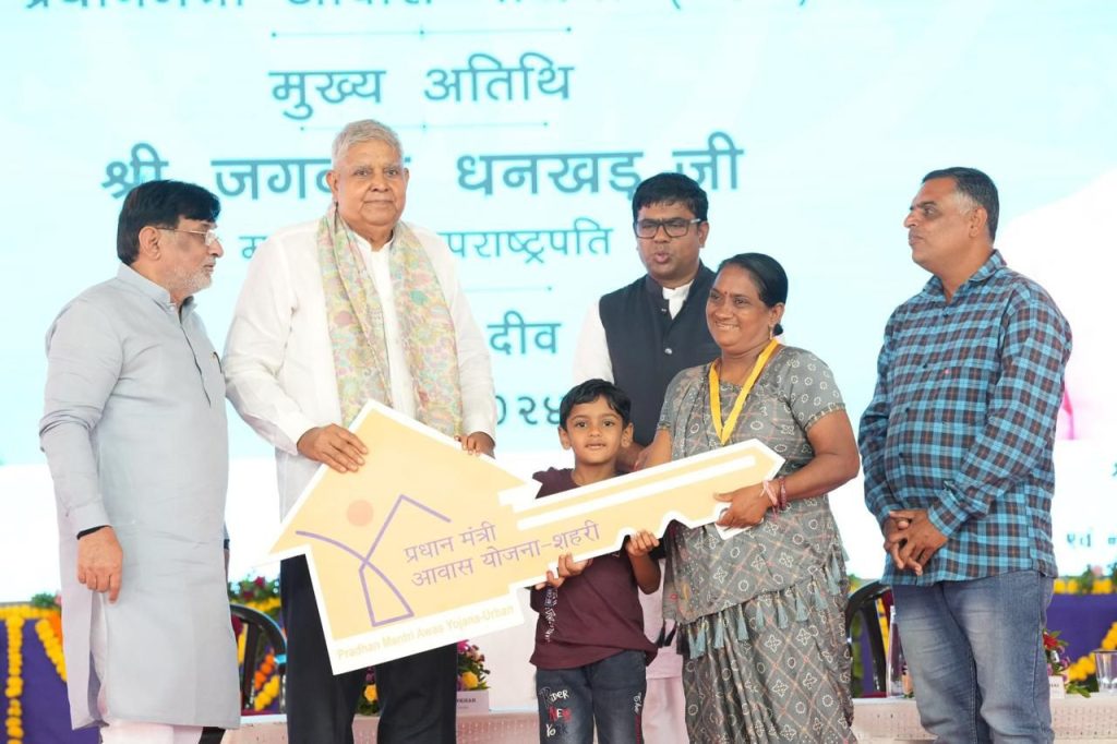 भारत के माननीय उप राष्ट्रपति श्री जगदीप धनखड़ जी संघ प्रदेश दीव के दौरे के अपने तीसरे दिन माननीय उपराष्ट्रपति जी ने प्रधानमंत्री आवास योजना में बने आशियाने का लोकार्पण किया और लाभार्थी परिवारों की सभी महिला सदस्य का मुँह मीठा करवाया, साथ ही उन्हें अपने आशियाने की चाबी भी सौंपी और लाभार्थी परिवारों को हार्दिक बधाई दी ।