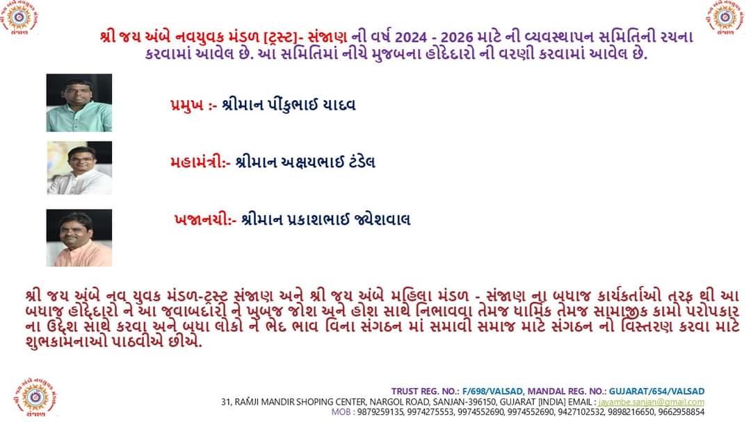 संजान “श्री जय अंबे नवयुवक मंडल”(ट्रस्ट) वर्ष 2024 से 2026 तक के लिए पिंकूभाई यादव को प्रमुख पद के लिए नियुक्त किया गया है,