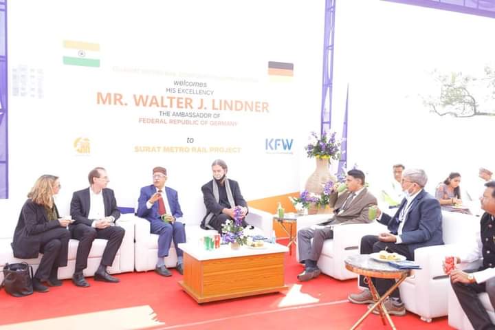 मेट्रो प्रोजेक्ट के निदेशक श्री सहदेव सिंह राठी ने जर्मन राजदूत को समग्र दृष्टिकोण के बारे में जानकारी दी।उन्होंने सूरत शहर के चोकबाजार में ऐतिहासिक किले का भी दौरा किया ।कलेक्टर श्री आयुष ओक एवं मेयर श्रीमती हेमाली बोघावाला ने अधिकारियों के साथ बैठक कर स्मार्ट सिटी के रूप में प्रगति कर रहे सूरत शहर की जानकारी ली।साथ ही मेट्रो परियोजना का संचालन और प्रगति से अवगत किया।जर्मनी के राजदूत श्री वाल्टर जॉन्स लिंडनर, जो सूरत शहर के पहले अतिथि थे, सूरत की सफाई से प्रभावित हुए।इस अवसर पर श्री वाल्टर ने कहा कि सूरत एक स्मार्ट सिटी के रूप में विकसित हो रहा है,उस समय जर्मनी और फ्रांस की सरकारों ने शहर की मेट्रो परियोजना के लिए 5434 करोड़ रुपये की ऋण सहायता प्रदान की थी।ताकि भविष्य में शहर के लोगों को सुरक्षित और तेज यात्रा का लाभ मिले।उन्होंने परियोजना को जल्द पूरा करने के लिए वित्त पोषण के साथ-साथ अन्य तकनीकी सहायता प्रदान करने का वादा किया।राजदूत व अन्य सदस्यों ने पौधरोपण कर पर्यावरण संरक्षण का संदेश दिया।इस अवसर पर सूरत मेट्रो परियोजना निदेशक सहदेव सिंह राठी ने कहा,सूरत के लोगों के लिए इस बेहद महत्वपूर्ण परियोजना में अनुमानित 50% निवेश जर्मनी और फ्रांस की सरकारों द्वारा किया गया है,इसलिए मेट्रो प्रोजेक्ट में आधुनिक सिस्टम का इस्तेमाल किया जा रहा है।जिससे इस प्रोजेक्ट का काम जल्दी और समय पर पूरा हो सकेगा।118.6 किमी के लिए मेट्रो लाइन वर्तमान में प्रचालन में है,जिसमें 6 अंडरग्राउंड स्टेशन, 6.7 किमी टनल और 10 स्टेशनों का काम प्रगति पर है।इसके अलावा ड्रीम सिटी में 20 स्टेशनों की लाइन के लिए डिपो पर भी काम तेज किया जा रहा है.श्री स्टीफन कोच, अर्थशास्त्र और वैश्विक मामलों के मंत्री, मुंबई के कार्यवाहक महावाणिज्य दूतावास और जर्मन वाणिज्य दूतावास सुश्री मारिया ईनिंग, राजनीतिक और आर्थिक मामलों के वरिष्ठ सलाहकार, श्री आशुमी श्रॉफ इस अवसर पर उपस्थित थे।