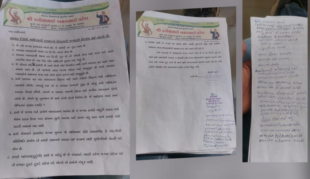 तपोवन,संजान :वलसाड तालुका के मुली गांव में, वडोदरा-मुंबई एक्सप्रेस वे में प्रभावित 44 परिवार, जो बेघर होने वाले हैं,आदिवासी समुदाय के लोगों के साथ, वलसाड कलेक्टर को एक आवेदन प्रस्तुत किया।स्थानीय लोगों के अनुसार विकास के नाम पर समाज के लोगों को विस्थापित किया जा रहा है।बेघर 44 परिवारों ने सरकारी अधिकारियों को अपनी इच्छा व्यक्त की, मुली गांव में जहां एक सरकारी जगह होगी वहा जगह आवंटित करने का प्रस्ताव था हम इस विभाग के अधिकारी से कहना चाहते हैं कि हम इस आदिवासी देश के मालिक हैं और हम भीख नहीं मांग रहे हैं।कुछ स्थानीय लोग इस जगह के आवंटन का विरोध कर रहे हैं।हमारे भगवान बाबा साहब ने हमें संविधान की ताकत दी है।जहां मुली गांव के सरपंच श्री उम्मेद भाई, जितेंद्रभाई पटेल बीटीएस अध्यक्ष श्री वलसाड,बीटीपी तालुका अध्यक्ष श्री वलसाड मयूरभाई पटेल, हिरेनभाई पटेल, आदिवासी सामाजिक कार्यकर्ता हर्षदभाई,जिगर भाई मुली, केयूरभाई और मुली गांव के नेता और योद्धा मौजूद थे ।आदिवासी समुदाय के अधिकारों के लिए लड़ने वाले योद्धा मौजूद थे। और धरमपुर के आदिवासी समुदाय उनके पक्ष में है।धरमपुर तालुका पंचायत आदिवासी निर्दलीय सदस्य कल्पेश पटेल पूरी तरह से मूली गांव के साथ इनके अधिकारों की लड़त में साथ रहे है ।