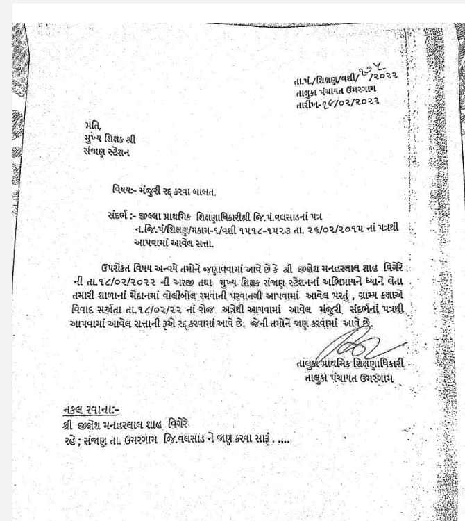 तपोवन,संजान:ता.18-02-2022 के दिन उमरगाव तालुका शिक्षण अधिकारी द्वारा संजान के जिग्नेश मनहरलाल शाह को प्राथमिक स्कूल के मैदान में वॉलीबॉल खेलने की मंजूरी दी गईं,मंजूरी पत्र में एडवांस भाड़ा भरने का उल्लेख किया गया था,लेकिन संजान प्राथमिक स्कूल में बिना कोई फण्ड जमा किये इन्होंने स्कूल के मैदान की जगह पर नही बल्कि स्कूल गेट के कंपाउंड में वॉलीबॉल खेला गया,इसकी जानकारी तालुका शिक्षण अधिकारी को दि गई,शिक्षण अधिकारी ने इस मामले पर तत्कालिक फैसला लेते हुवे ता.19-02-2022 के दिन यह मंजूरी रद्द कर दि गई