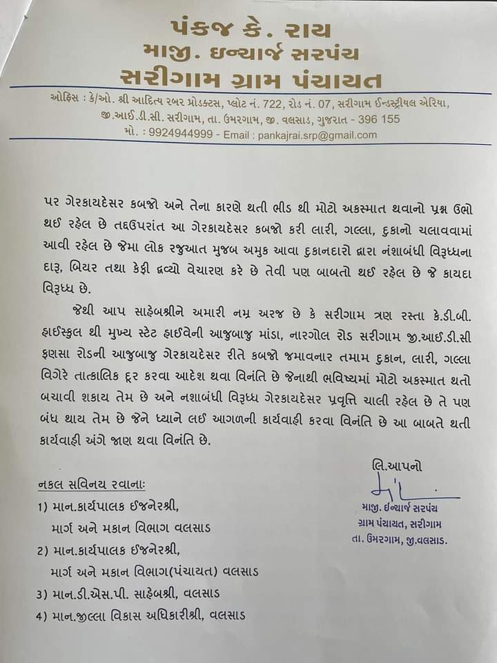 तपोवन, संजान:माजी इंचार्ज सरपंच पंकज राय ने वलसाड कलेक्टर को पत्र लिखकर गेर कानूनी सरकारी जमीन पे कब्जा कर रहे के खिलाफ कार्यवाही कर ट्राफिक समस्या का हल निकाल ने के लिए कहा। केडीबी हाई स्कूल से मांडा,नारगोल रोड और सरिगम तक तीन रास्ते,जीआईडीसी ,फंसास्टेट हाईवे और सरिगाम मांडा नारगोल रोड पर पी डब्ल्यू दी विभाग की जमीन पर अवैध रूप से कब्जा करने वाले लोगों द्वारा लॉरी, गलियां, दुकानें, बड़े टेंट और बाजार स्थापित किए जा रहे हैं. सरिगाम फंसा मुख्य राज्य राजमार्ग के किनारे एक बड़ा प्राथमिक विद्यालय और केडीबी हाई स्कूल स्थित है, आसपास बड़े कारखाने हैं । बड़े-बड़े कंटेनर, कुंड इस ओर आ रहे हैं। इसके अलावा, सरिगाम क्षेत्र एक औद्योगिक एस्टेट से जुड़ा एक क्षेत्र है जिसमें 600 से अधिक कंपनियां हैं जिनका ट्राफिक भी इस तरह से आता रहता है। काम करने वाले लोग भी इस तरह से आते रहते हैं हजारों लोग आते रहते हैं मुख्य राज्य राजमार्गअवैध कब्जे और परिणामी भीड़ एक बड़ी दुर्घटना का कारण बन रही है। इस अवैध कब्जे के अलावा, लारी गल्ला, दुकानें चलाई जा रही हैं. कुछ ऐसे दुकानदार मादक द्रव्य, बीयर और कैफीन बेच रहे हैं,जो कानून के खिलाफ है। सरिगाम तीन रास्ते माण्डा- नारगोल रोड, सरिगाम, जीआईडीसी, फंसा रोड के आसपास की सभी अवैध कब्जे वाली दुकानों, लॉरी, गल्ला आदि को हाई स्कूल से मुख्य राज्य राजमार्ग तक तत्काल हटाने का अनुरोध किया जाता है, जिससे भविष्य में होने वाले बड़े हादसों को रोका जा सके और नशाखोरी को रोका जा सके,इस पर कार्रवाई की मांग की है।