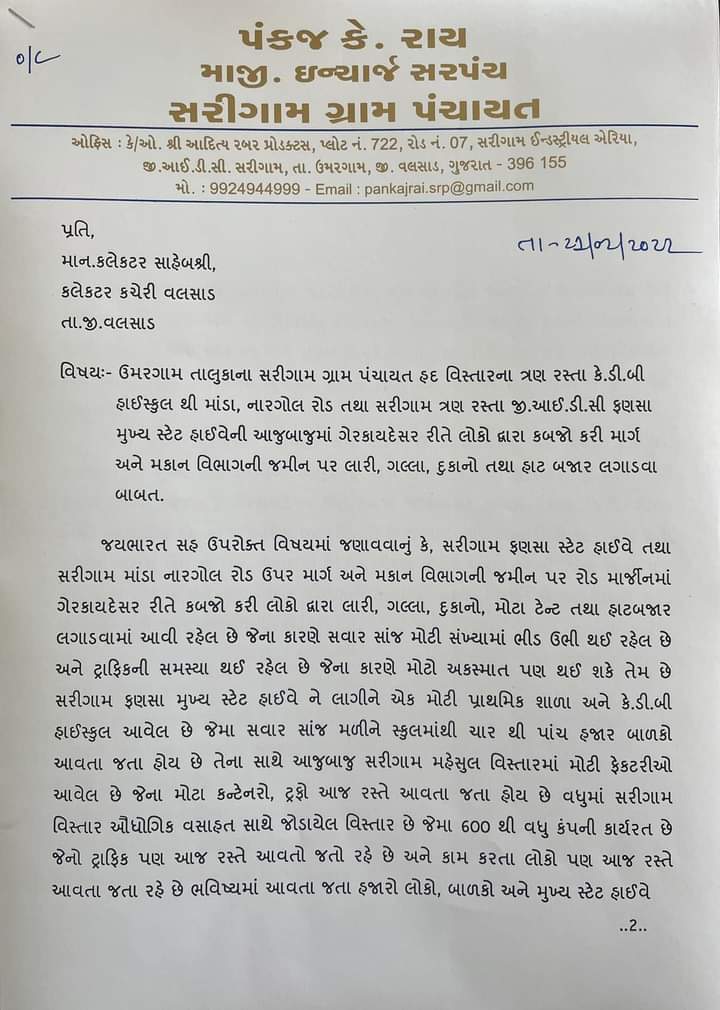 पत्र में पंकज राय ने यह भी लिखा है कि अगर पूरे कागजात नही प्राप्त है तो किस आधार पर काम सोंपे गए और उसका जवाबदार कोन है,उसका भी लिखित में जवाब देने की मांग की साथ ही तालुका विकास अधिकारी उमरगांव, जिल्ला विकास अधिकारी वलसाड,विकास कमिश्नर श्री गांधीनगर,कमिश्नर श्री ताकेदारी आयोग गांधीनगर इन सभी को यह नकल रवाना की